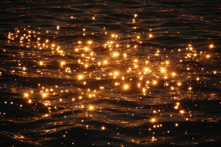 Shimmering surface of water reflects golden hues, creating mesmerizing pattern of light and movement. tranquil waves evoke sense of calm and beauty in nature
