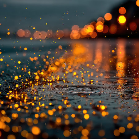 This mesmerizing image captures the gentle ripples on a water surface, enhanced by soft bokeh lights that create a serene and calming atmosphere perfect for backgrounds.