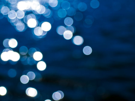 Stars in dark water. Out of focus bokeh background of blue water with sun reflections