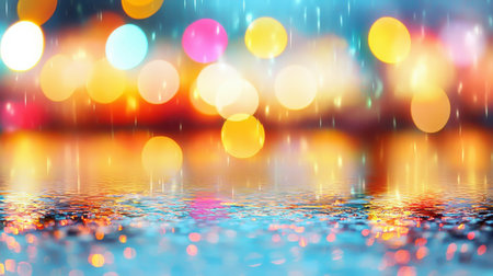 A vibrant rainy night scene showcasing colorful bokeh lights reflecting on a wet surface. This image captures the serene ambiance of a city evening filled with rain.