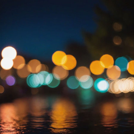 A night scene showing colorful bokeh lights reflecting on water, creating vibrant abstract