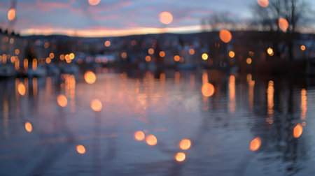 Bokeh lights reflecting off the surface of a calm lake at twilight
