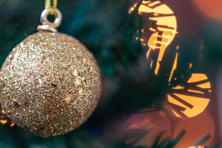 Gold festive glass ball with colored sparkles, Christmas tree and beautiful yellow bokeh of glowing garland. Blurred background.