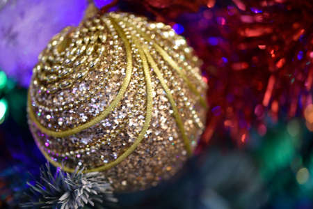 Shiny balloons and colorful tinsel elements of Christmas tree decoration, Close-up, selective focus. New year and christmas