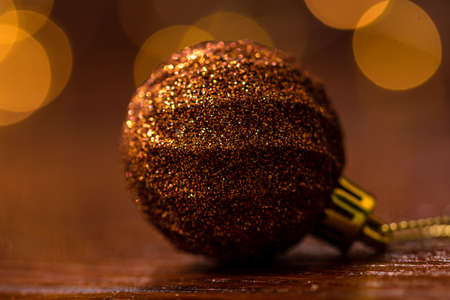 macro gold Christmas toys background. Preparing to decorate Christmas tree. New Year decoration. Festive holiday mood. Selective focus. Christmas card.