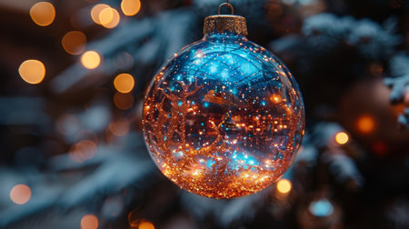 This enchanting image features a detailed Christmas tree ornament that sparkles amidst a backdrop of soft bokeh lights, evoking a cozy and joyful holiday spirit.