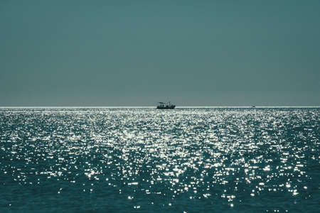 A long range shot of a boat sailing on the sea reflecting the sun with clear blue sky in the background