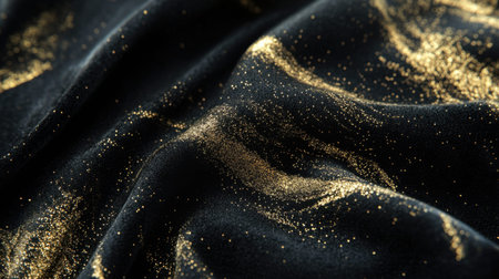 Close-up view of rich black fabric adorned with shimmering golden glitter accents. This elegant textile serves as a stunning backdrop ideal for fashion design or special occasions.