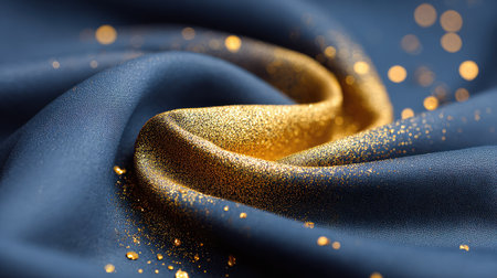 This stunning image features a navy blue fabric with golden glitter particles, creating a luxurious and elegant background perfect for fashion and interior design projects.
