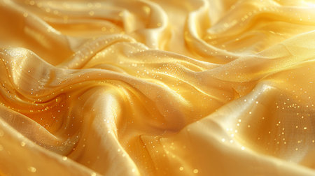 A close-up view of shimmering golden fabric flowing gracefully, showcasing intricate textures and soft waves. Generative AI