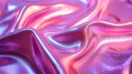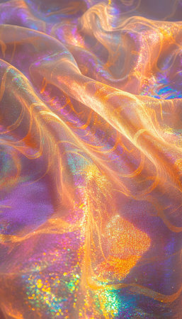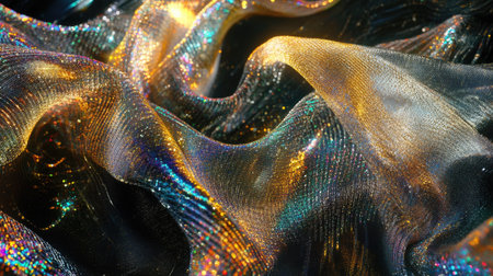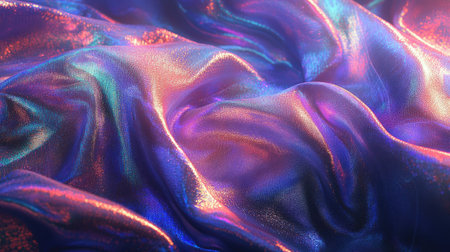 A captivating close-up of shimmering iridescent fabric displaying colorful reflections and gentle wrinkles. This image showcases intricate textures and a vibrant aesthetic perfect for various design projects.