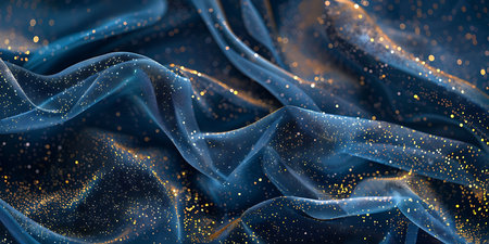A close-up of shimmering blue fabric with gold glitter sparkles and soft folds creating a luxurious and vibrant atmosphere perfect for fashion or artistic projects.