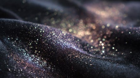 A close-up view of glitter scattered across black fabric, creating a soft and ethereal appearance. The shimmering details enhance artistic projects and backgrounds.