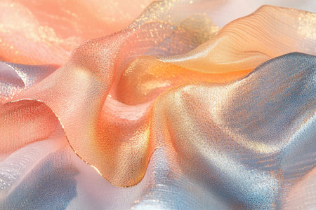 This image showcases a close-up of iridescent satin fabric, featuring soft waves and a pastel color gradient. The texture highlights elegance and luxurious appeal.