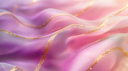 Close-up of flowing pink sheer fabric adorned with shimmering gold glitter accents, creating a luxurious and delicate texture.