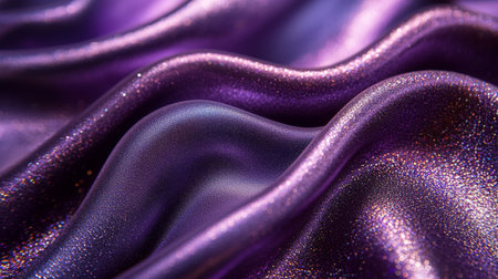 A detailed close-up of metallic purple fabric with sparkling, wavy folds, showcasing a luxurious and glamorous texture with vibrant shimmer.