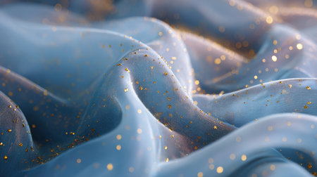 Luxurious light blue sheer fabric is draped into soft waves and sprinkled with sparkling gold glitter and bokeh lights. This elegant and dreamy texture is perfect for celebrations, fashion, and abstract luxury backgrounds.