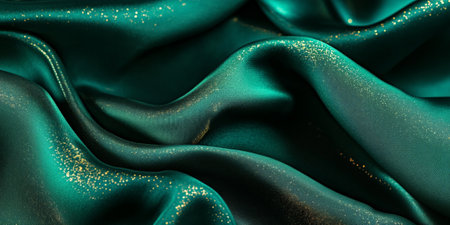 Deep emerald green silk fabric with soft folds, golden sparkles, and a refined glossy sheen, creating a sense of elegance and exclusivity