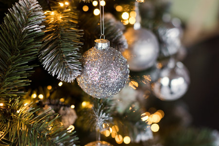 A festive and elegant close-up view of shimmering silver Christmas tree ornaments. The soft bokeh lights in the background add a magical and celebratory atmosphere, perfect for holiday decorations.
