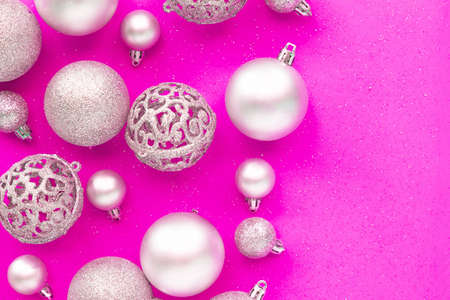 pink pearl and pink shiny Christmas balls decoration on pink background. Christmas and new year decor