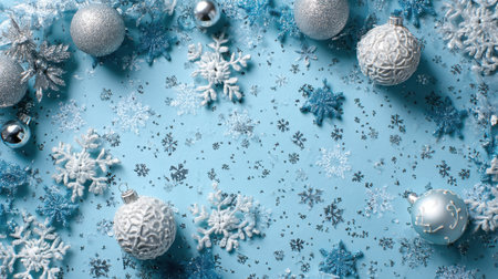 This vibrant and festive winter scene features shimmering blue tones, silver and white ornaments, and intricate snowflakes, perfect for holiday celebrations and seasonal decor.