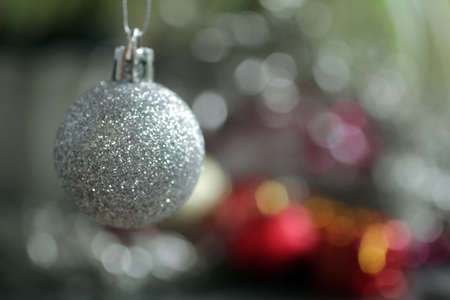 concept of festive silver christmas ornaments with bokeh lights and glitter.