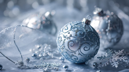 Beautiful silver Christmas ornaments set against a sparkling bokeh backdrop. Ideal for festive themes, holiday decorations, and winter celebrations, conveying warmth and joy.