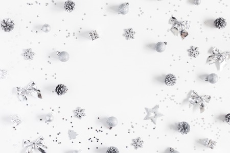 Christmas composition. Frame made of white and silver decorations, pine cones on white background. Christmas, winter, new year concept. Flat lay, top view, copy space