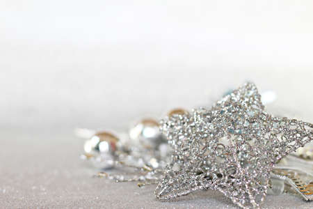 Happy New Year, Merry Christmas, celebration or holiday background concept : Star and shiny silver ornaments on bright abstract background bokeh, Top view or flat lay with copy space