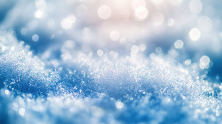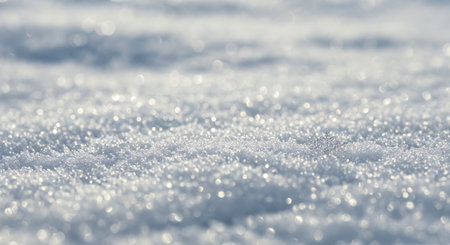 A pristine blanket of glistening white snow is captured in a macro perspective, emphasizing the intricate details of individual ice crystals and shimmering light with soft bokeh.