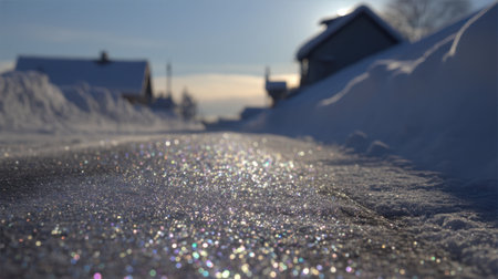 A breathtaking view of a shimmering snowy pathway illuminated by sunlight, framed by snow-covered houses and a beautiful clear blue sky, creating a tranquil winter scene.