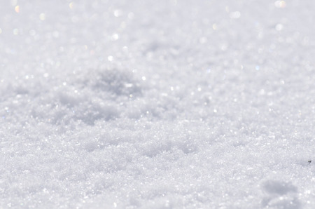Snowy white background. The texture of the snow. Shiny snow with bokeh and blurred background close-up. White snow-covered field. Macro photo of snow.