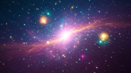 Exploding star shapes illuminate vibrant multi colored galaxy backdrop in space generated by artificial intelligence