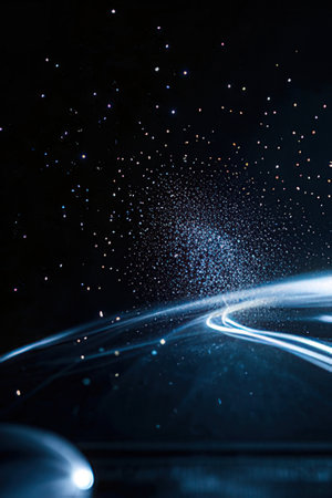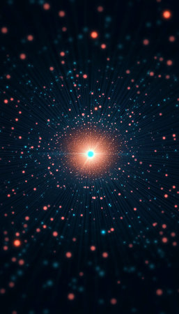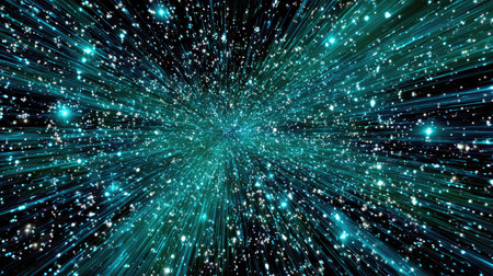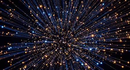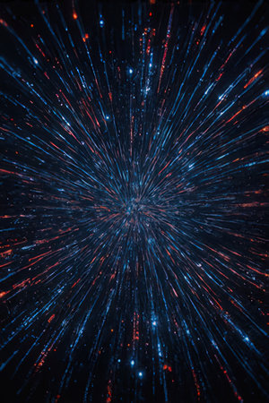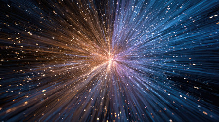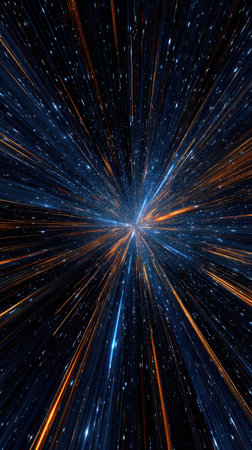 An abstract illustration presents a starfield with numerous radiating light streaks. The composition features a symmetrical arrangement of lines and points of light, in shades of blue and orange against a dark backdrop. This imagery suggests themes of movement, energy, and cosmic expanse, suited for various creative and design applications.