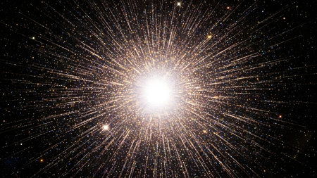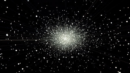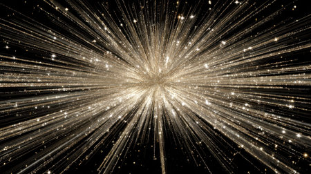 Dazzling explosion of light radiates outward, creating mesmerizing display of shimmering particles against dark background. This captivating visual evokes feelings of wonder and excitement