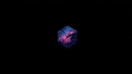 An isolated cube displays a vibrant cosmic design of stars and nebulae against a black background. The artwork features a geometric form with a detailed, colorful texture. The composition utilizes high-contrast lighting to create a dramatic visual effect. Suitable for use in conceptual projects, design elements, and backgrounds.