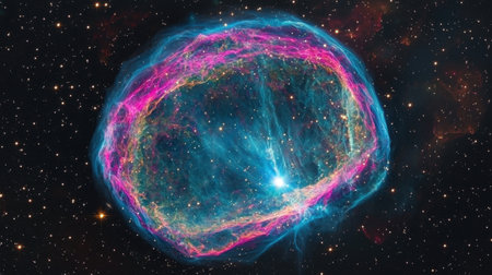 Light particles explode in a cosmic display, creating a mesmerizing burst of colors and patterns in deep space
