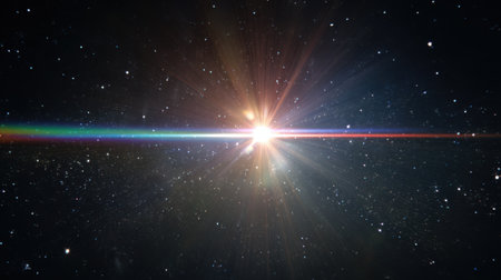 Rainbow lens flare shining against a starry sky, creating a cosmic and mystical light effect