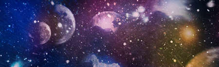 Space scene, background, web banner. Colorful fractal nebula with planet. 3D rendering