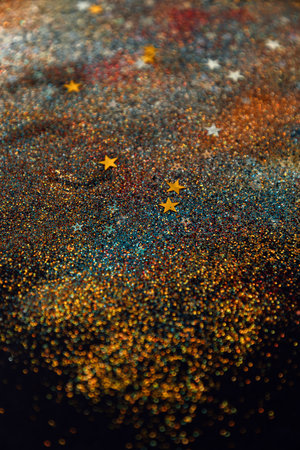 Celebrate with colorful confetti and sparkling glitter on a black background