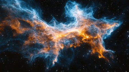 A stunning nebula showcases brilliant shades of blue, purple, and orange, revealing cosmic gas and stars in deep space.