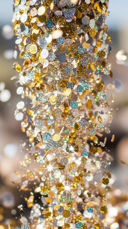 Vibrant showing a vibrant explosion of golden and silver confetti and glitter bursts outwards from a central point creating a energetic, and celebratory abstract...