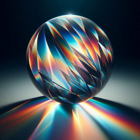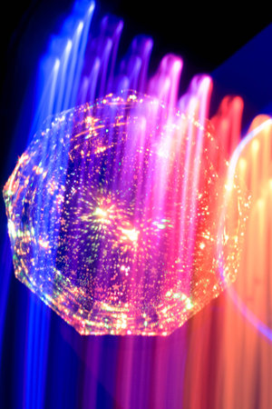 Neon color light trails reflected in crystal, lens ball with blue background.