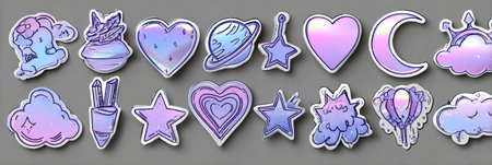Holographic y2k label stickers with rainbow gradient, Black Friday tags and retro design icons. Chrome effect with smiling face, star and sale badge. Nostalgic elements for marketing or social media