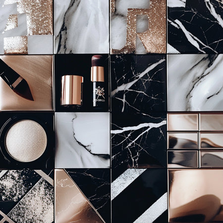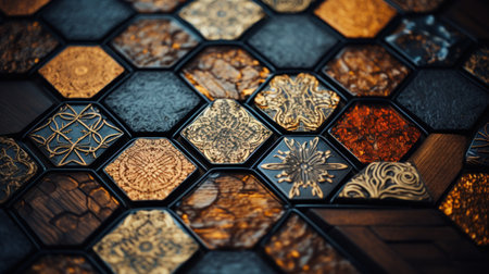 Elegant black and gold tile texture with varied finishes for interior design and decor