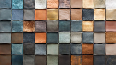 This close-up image showcases an adorned wall featuring unique tiles in various shades, highlighting modern design and intricate texture for stylish interiors.