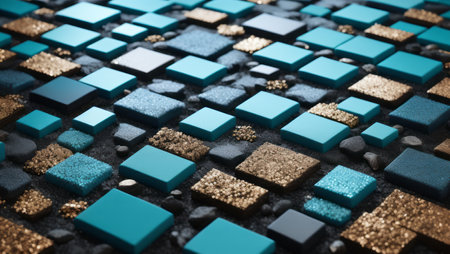 A vibrant close-up of a mosaic tile pattern in various blue shades, showcasing artistic design with light and shadow interplay. Ideal for interior decor inspirations.