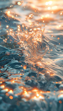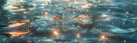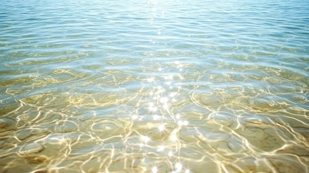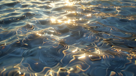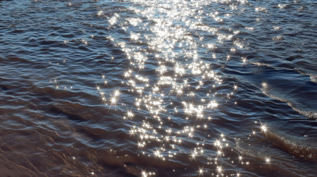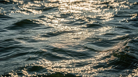 A beautiful close-up of water surface illuminated by sunlight creates sparkling reflections and gentle waves, providing a tranquil and serene atmosphere perfect for relaxation.