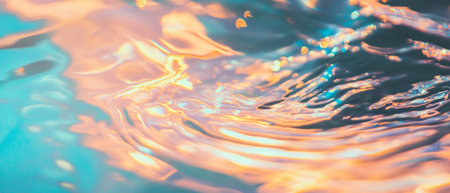Shimmering surface of water reflects golden hues, creating mesmerizing pattern of light and movement. tranquil waves evoke sense of calm and beauty in nature