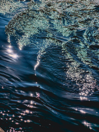 Ocean wave background. Bubble water foam backdrop. Tranquil sea texture. Messy water flow. Ripples on lake water. Idyllic dreamy sunlight glitter.
